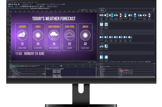 Creators can use output from popular motion-graphics tools and industry-standard file types to build sophisticated animated content. It supports combining photo-realistic 3D animations, audio, video, and both still and animated images.